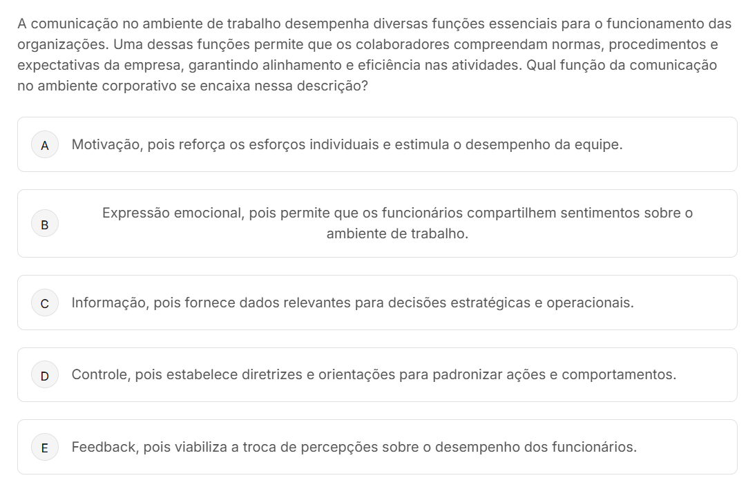 Acomunicaçãonoambientedetrabalhodesempenhadiversasfunçõesessenciais para O funcionamento das organizações. Uma dessasfunçõespermite que os colaboradores compreendam normas, procedimentos e expectativas da empresa, garantindo innamento e eficiência nas atividades.