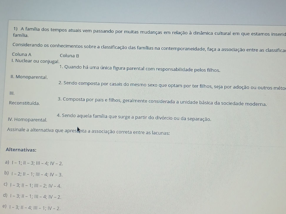 Questão 10 Afamíliadostemposatuaisvempassandopormuitasmudançasem relaçãoàdinâmica cultural em que estamos inseridos. Sabemos que existem muitos aspectos importantes de serem considerados em nossos estudos em educação e diversidade sobre afamília.