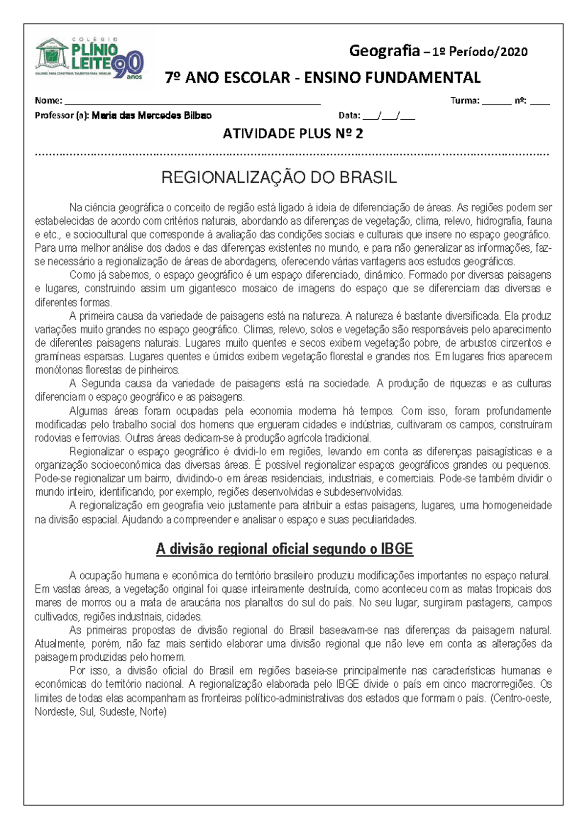 Atividades Sobre Regionalização Do Brasil 7 Ano Com Gabarito - RETOEDU