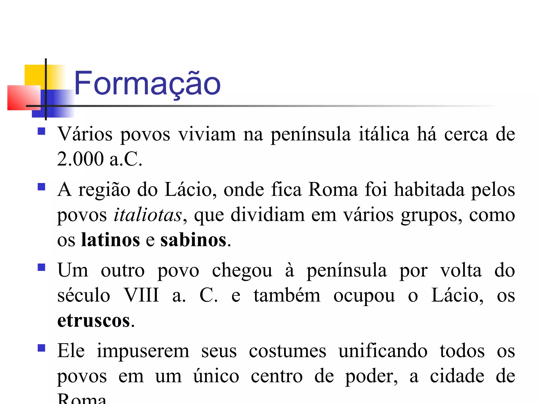 ARomaAntigaconheceu 3 formas de governo:Monarquia, República e Império.Durante todaaIdade Média,Romamanteve parte da suaantigaimportância, mesmo comapopulação reduzida.