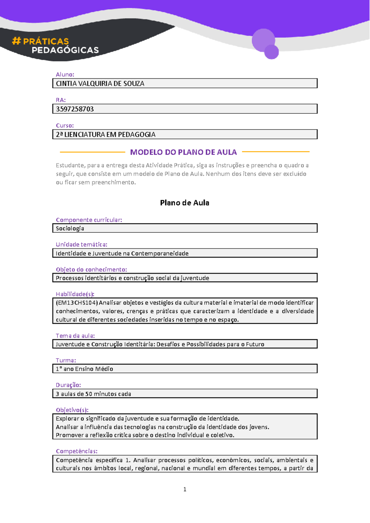 Este documento fornece detalhes sobre aspráticaspedagógicasdeum aluno, incluindo objetivosdepromover a articulação entre teoriaepráticaedominar estratégiaspedagógicasalinhadasàBNCC.