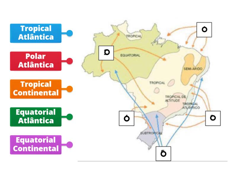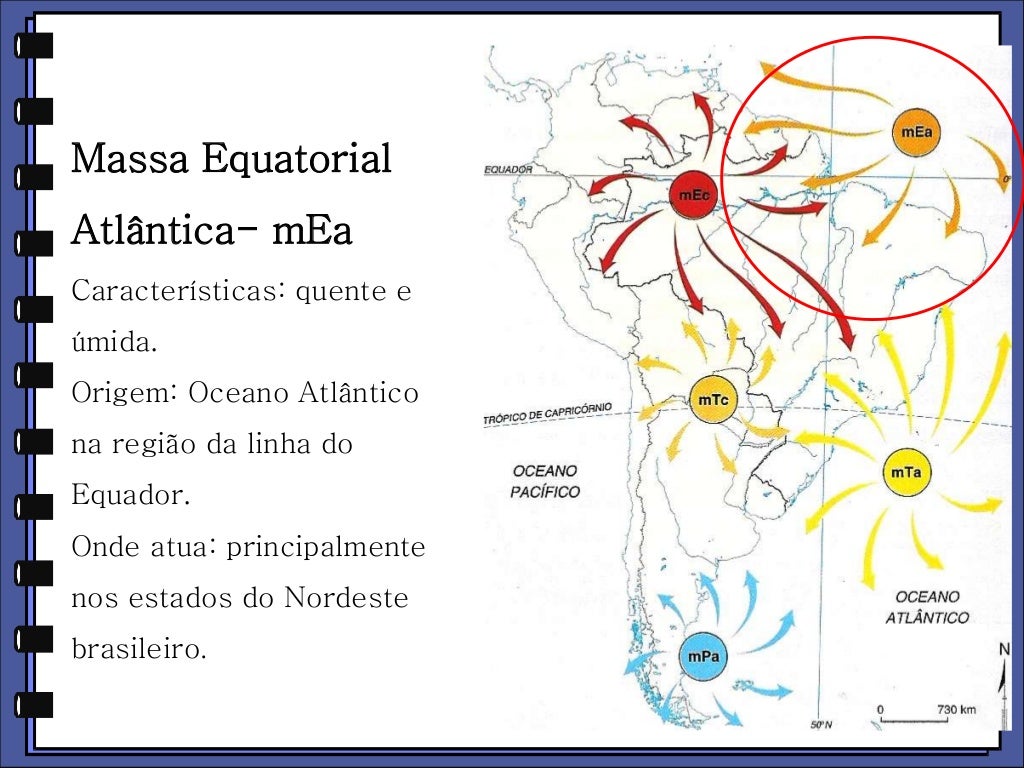 AsqueatuamnoBrasilsão:MassaEquatorial Continental (mEc),MassaEquatorial Atlântica (mEa),MassaTropical Continental (mTc),MassaTropical Atlântica (mTa) eMassaPolar Atlântica (mPa).